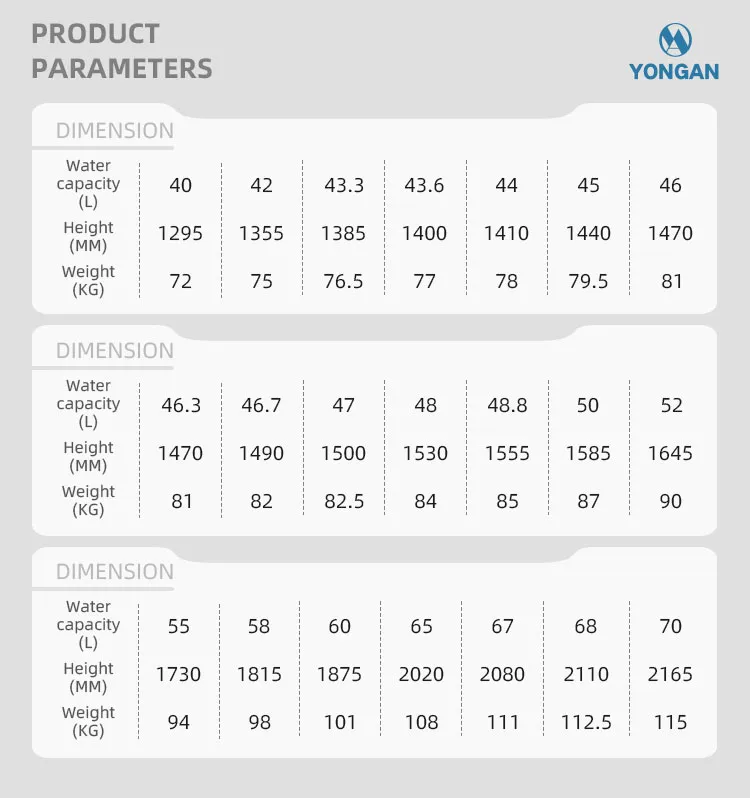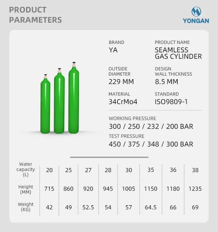 Бешавни челични цилиндар, пречника 229 мм и капацитета 20Л-70Л, различити модели нормализованих и мешовитих цилиндара, укључујући једанаест типова боца са компримованим гасом, укључујући кисеоник, азот, аргон, хелијум, водоник, криптон, неон, ваздух, угљен моноксид, азот оксид, хернија, угљен диоксид, азот оксид, сумпор хексафлуорид, хлороводоник, етан, етилен, трихлорометан, хексафлуороетан, винилиден флуорид, силан, фосфан и тетрафлуорометан